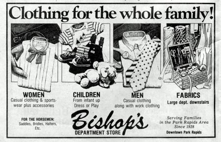 Bishop's was a fixture in Park Rapids, supplying everything a person could need for their home but also special clothing and gear for tourists. Harold Bishop's son, Rollis, took over the store in 1955. The building had two large additions, at the back and south sides in 1968. It allowed the store to keep more stock on site, ready to supply the people of Park Rapids and tourists who found themselves in need of some warmer clothes.