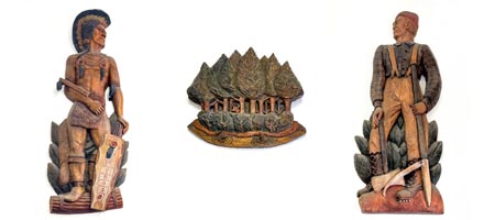 Please step into the building to view the panels. "Indian" represents the first people who settled in the land that would become Park Rapids. "Park Service Symbol" shows a natural scene of lakes and pines. The last, "Lumberjack in Setting," represents the timber industry that brought so many people and industries to Park Rapids. The three carvings were originally hung above the postmaster's door and continue to remain on display today.