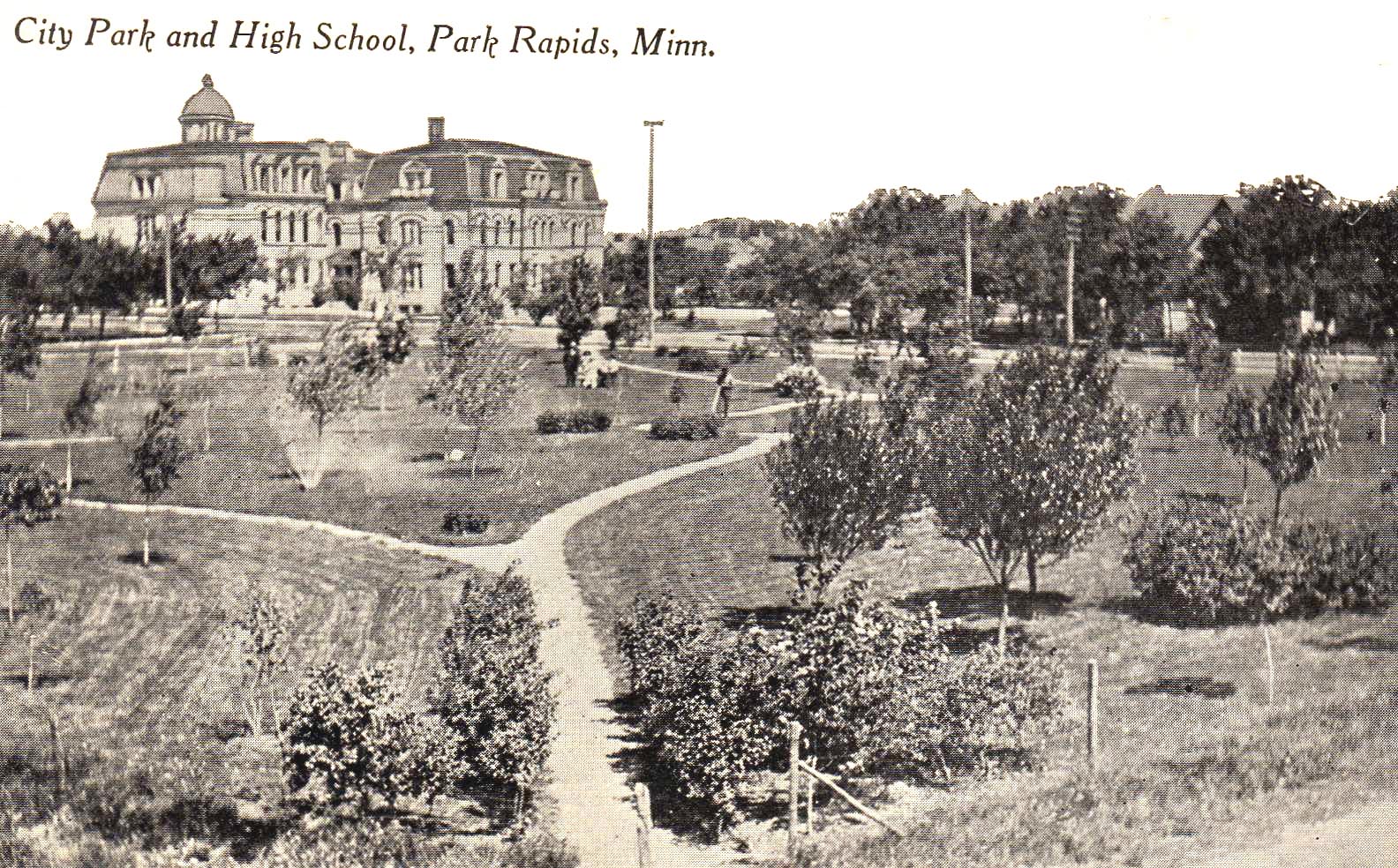 Park Rapids youth have attended school at many locations. This school was built in the late 1880s. The original school and an addition are viewed here across a city park where Hugo's Family Marketplace is now. The first section of the school burned in 1938.